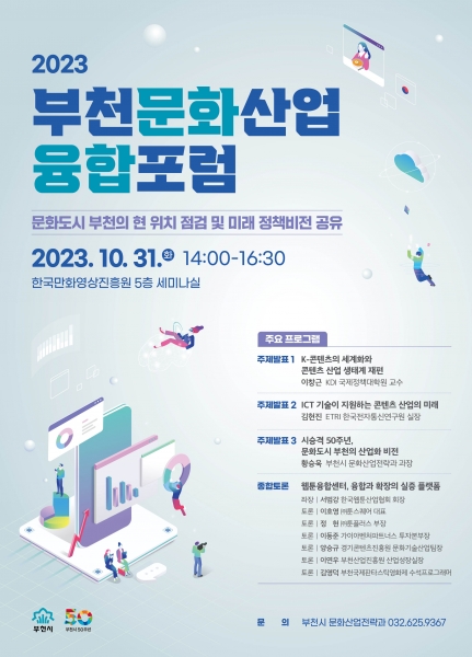 [금요저널] 부천시가 문화산업 백년대계 준비에 시동을 걸고 오는 10월 31일 오후 2시부터 한국만화영상진흥원 5층 세미나실에서 ‘2023 부천문화산업융합포럼’을 개최한다.