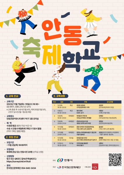 [금요저널] 안동시와 한국정신문화재단은 본격적인 사계절 축제 육성과 축제 기획·운영 주체의 역량 강화를 위해 ‘2023 안동축제학교’를 운영한다.