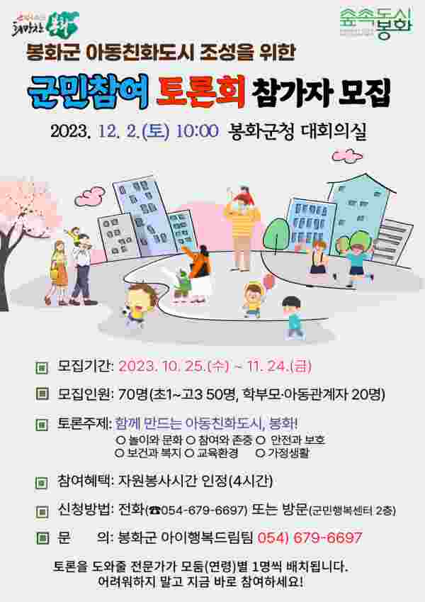 봉화군 “아동친화도시 조성 위한 군민참여 토론회 참가자 모집한다~”