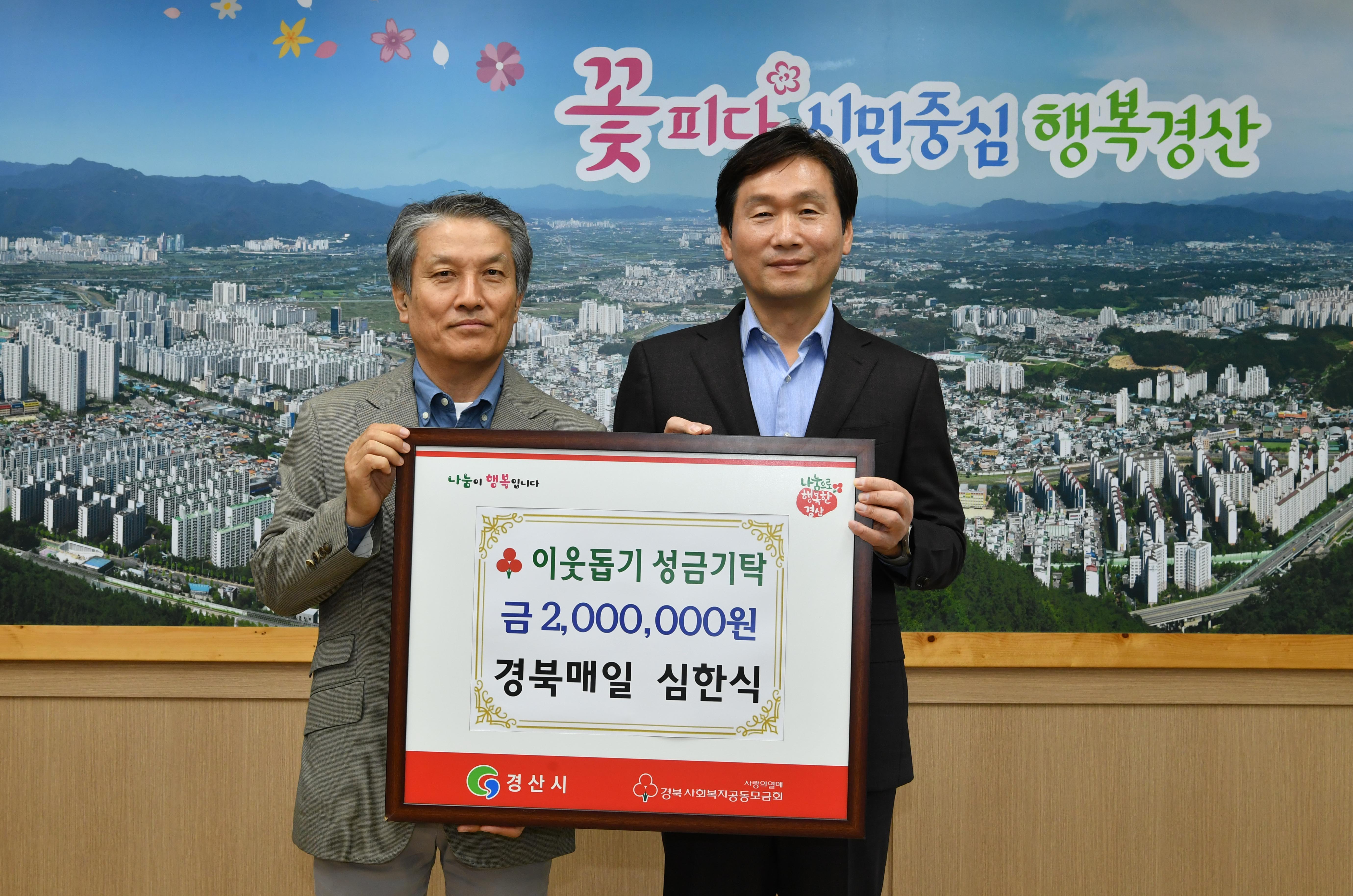 심한식 경북매일신문 기자가 3일 경산시청을 방문해 경산지역 저소득층을 위해 사용해 달라며 작년에 이어 이웃돕기 성금 2백만원을 기탁했다.