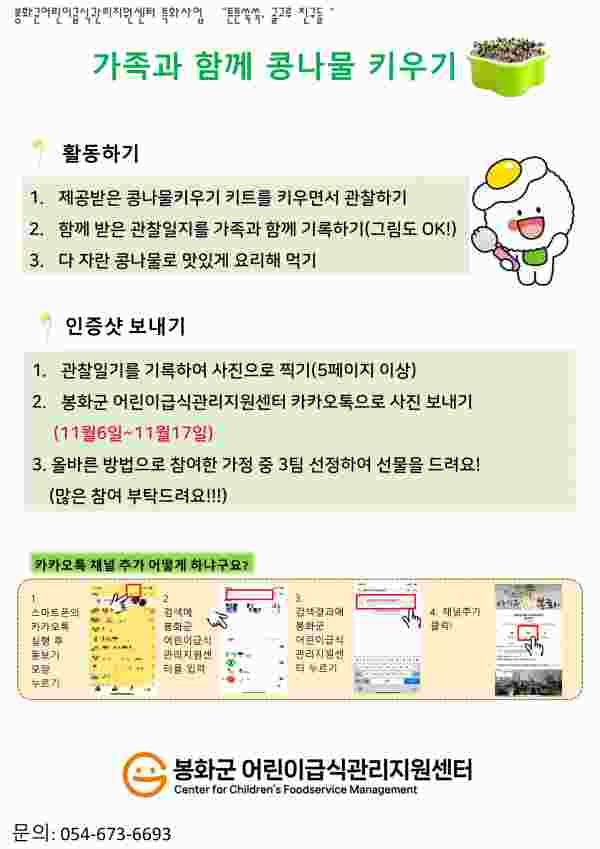 해당 프로그램은 신청자에게 제공되는 콩나물 키우기 키트로 직접 콩나물을 키운 뒤 콩나물을 이용해 요리를 만든 후 관찰일지 및 요리 소감 등을 작성해서 봉화군 어린이급식관리지원센터로 보내는 활동으로 구성돼 있다.
