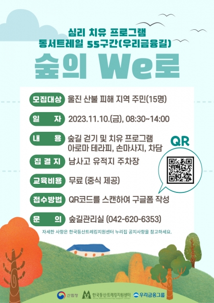 ‘숲의 We로’는 작년 울진 산불로 인해 피해를 입은 지역주민을 대상으로 진행되는 행사로 한국등산·트레킹지원센터가 주관하고 충북대학교 산학협력단이 진행한다.