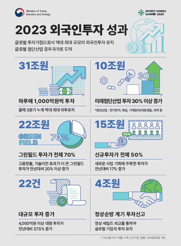 현재 우리나라는 전 세계 투자가 위축된 상황에서도 ‵22년 305억불, ‵23년 3분기 누계 239억불 등 사상 최대의 외국인투자 실적을 거듭 갱신하는 등 전 세계 투자가들의 주목을 받고 있다.