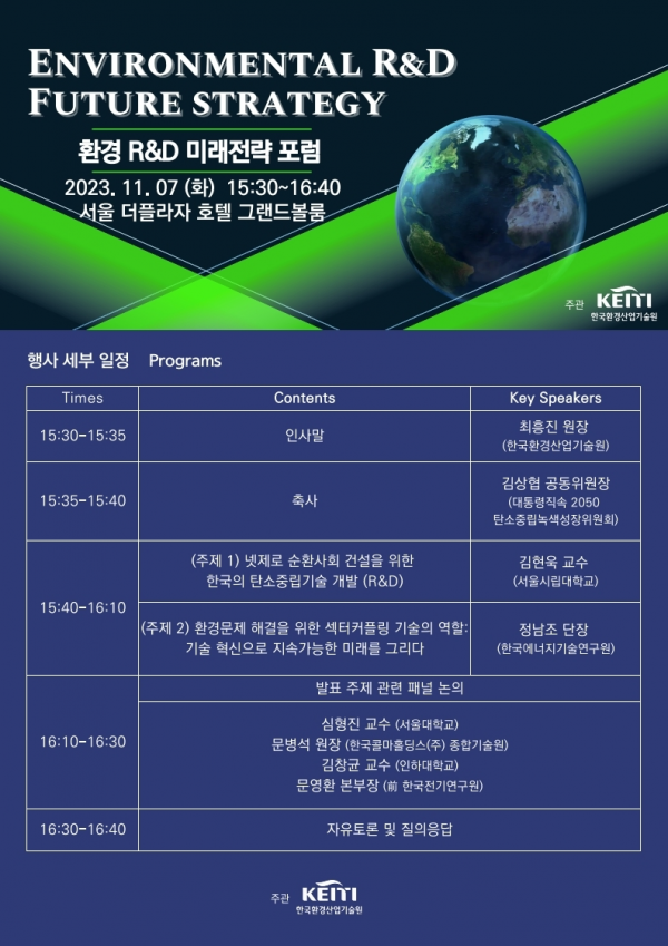[금요저널] 환경부 산하 한국환경산업기술원은 11월 7일 오후 더플라자호텔에서 ‘환경 연구개발 미래전략 토론회’를 개최한다.
