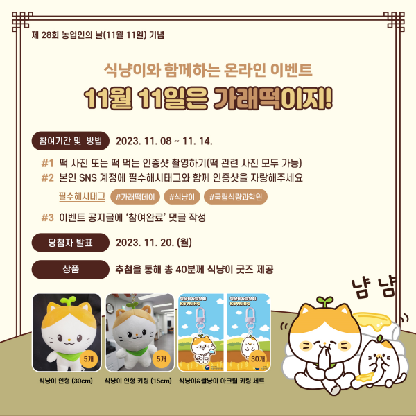 [금요저널] 농촌진흥청은 11월 8일부터 14일까지 국립식량과학원 기관 특징물 ‘식냥이’와 함께하는 온라인 행사 ‘11월 11일은 가래떡이지’를 진행한다.