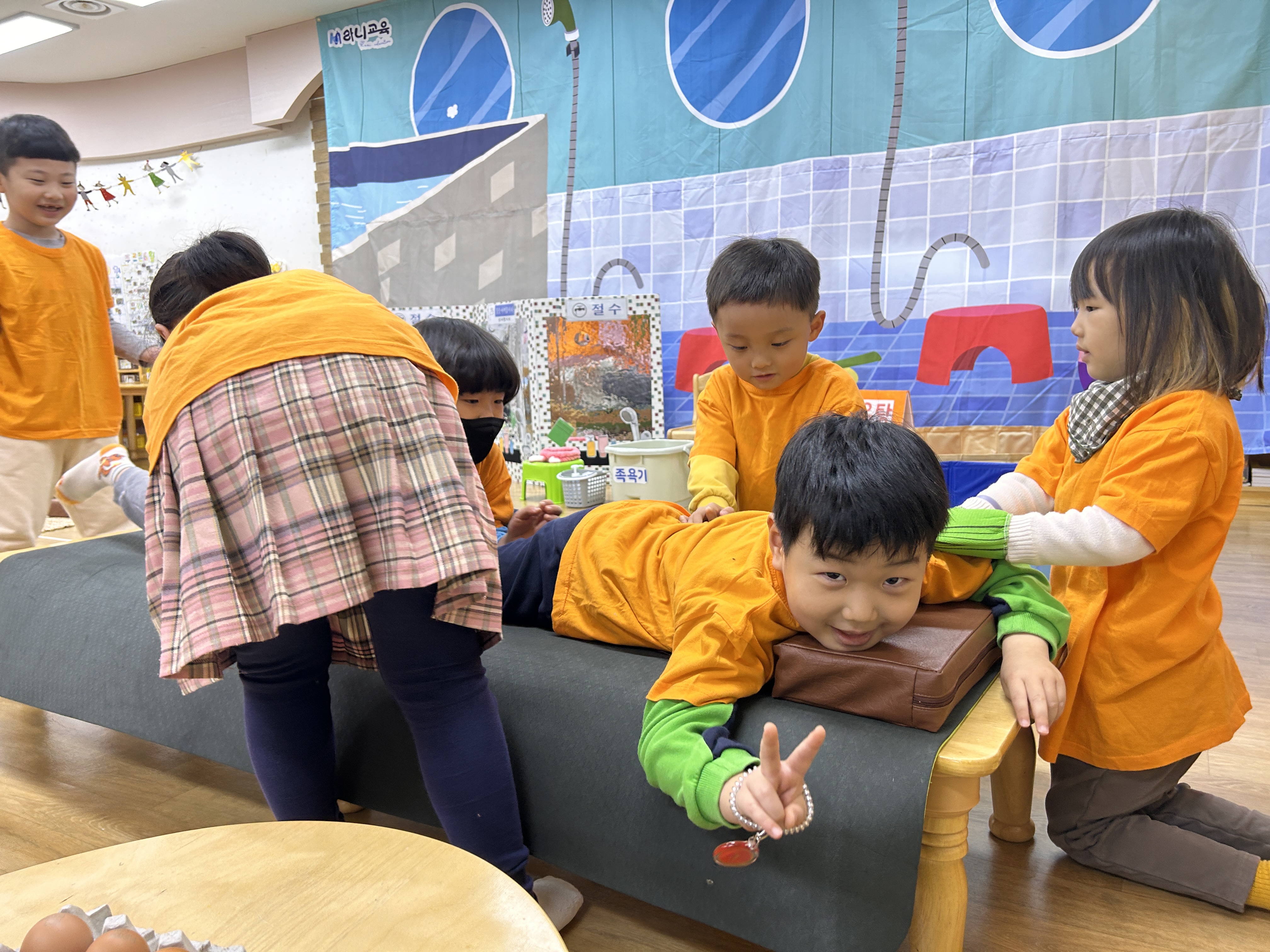 □ 교사와 유아들은 찜질방을 다녀온 경험을 이야기 나눈 후 놀이를 시작하였다. 수건으로 양모양 머리를 만들어 쓰고 찜질 놀이를 하고 구운 달걀과 식혜를 친구와 나누어 먹기도 하는 등 친구와 소통하며 놀이하는 시간을 가질 수 있었다.