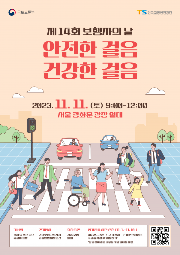 [금요저널] 국토교통부는 제14회 ‘보행자의 날’을 맞아 서울 광화문광장에서 11월 11일 오전 10시부터 기념식을 개최한다.