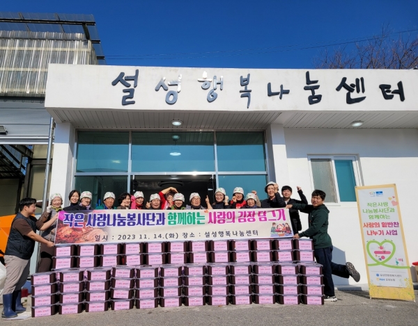 [금요저널] 설성면 작은사랑나눔봉사단에서는 11월 14일 어려운 취약계층 가구의 따뜻한 겨울을 보내기 위한 정성 가득한 마음을 담아 “사랑의 김장 담그기” 행사를 가졌다작은 사랑나눔봉사단은 매해 어려운 이웃들을 위해 사랑의 김장 김치 나눔 행사를 실시해 오고 있으며 올해도 봉사 단원들이 배추김치와 석박지를 직접 담가 설성면 관내 독거노인 및 장애인 등 저소득 취약계층 50여 가구를 방문해 안부확인과 함께 김장 김치를 전달했다.
