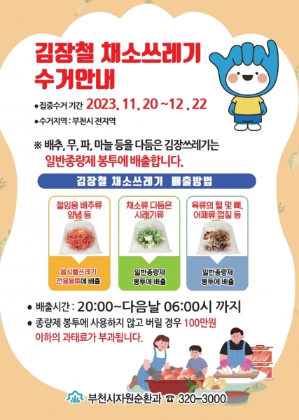 [금요저널] 부천시는 오는 11월 20일부터 12월 22일까지 김장철 채소 쓰레기 집중 수거 기간을 운영하고 올바른 배출 방법을 함께 홍보한다.