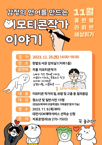 [금요저널] 대전 한밭도서관에서는 25일 오후 2시 자홍 이모티콘 작가 ‘자홍’을 초청해‘휴먼북 라이브 세상읽기’를 진행한다.