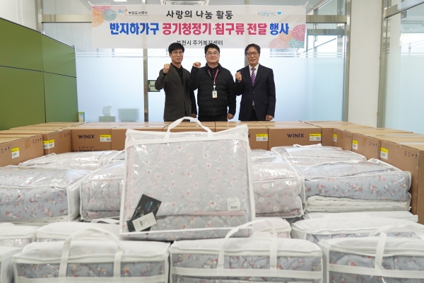 [금요저널] 부천시는 지난 20일 부천시주거복지센터와 함께 반지하 거주 25세대에 환경개선을 위한 맞춤 물품으로 공기청정기와 겨울 침구류 세트를 전달했다.