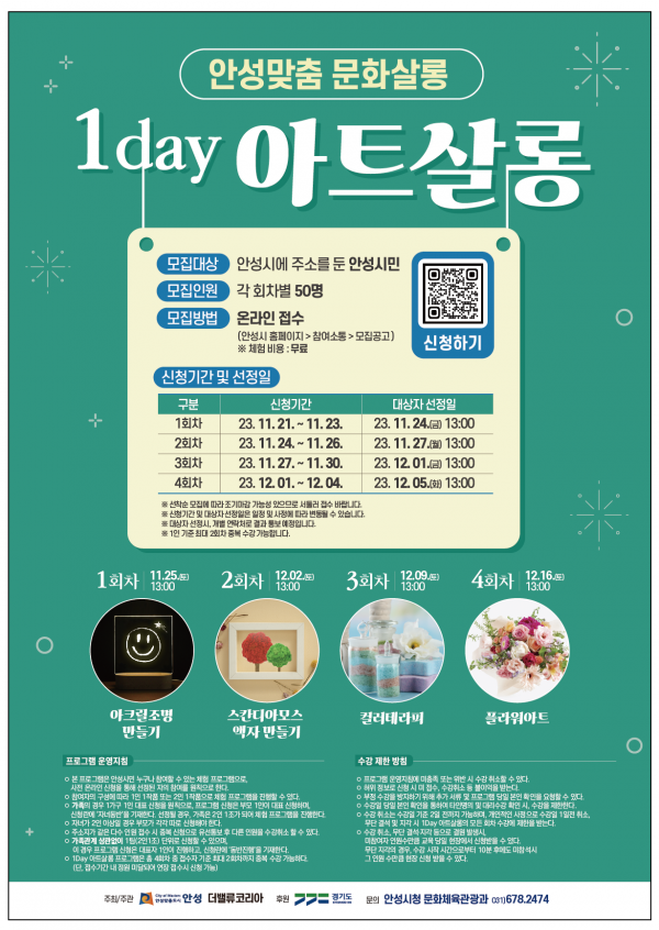 일상에 즐거움을 더해 예술로 만드는 ’1Day 아트살롱‘은 안성시민 누구나 참여 가능하며 신청은 안성시 홈페이지를 통해 가능하다.