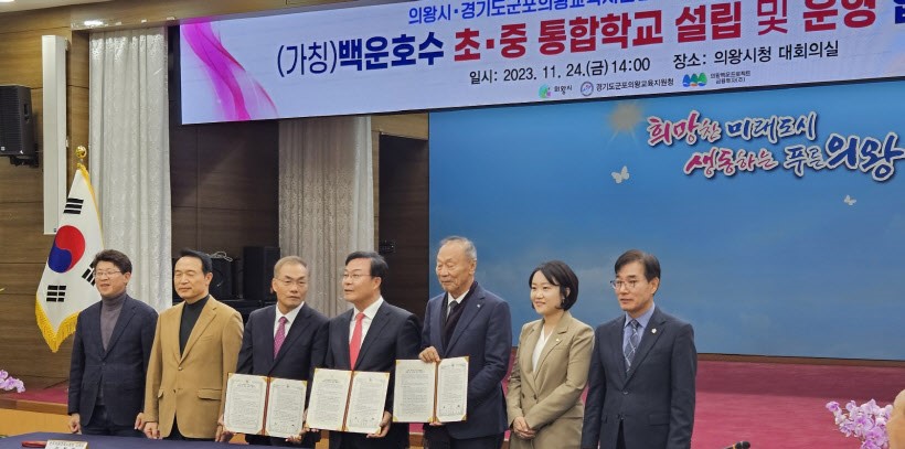 협약사항으로는 ▲통합학교 설립을 위한 유지원 부지 및 건물 등의 제공과 행정지원 노력(의왕시) ▲초·중 통합학교 설립을 통해 학생주도의 미래역량 함양 교육기회 제공 노력(교육지원청) ▲공공기여 일환으로 백운호수 초교 인접토지(유치원 부지)에 학교 건물을 건축해 시에 기부채납 및 신축건물 내 비품 및 백운호수 초교 내 체육장 증설 및 소방도로 확장 등을 학교에 기부채납(백운PFV) 등이 포함됐다.