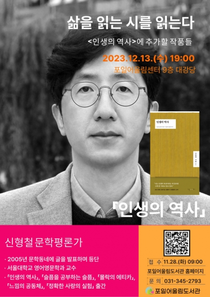 또 ‘인생의 역사’, ‘슬픔을 공부하는 슬픔’, ‘몰락의 에티카’ 등을 쓴 신형철 문학평론가의 강연이 12월 13일에 열린다.