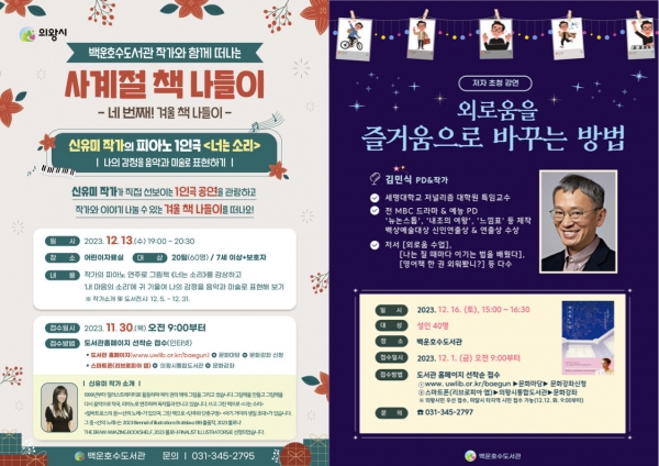 [금요저널] 의왕 백운호수도서관은 12월 어린이 동반 가족 및 성인을 대상으로 작가와의 만남을 두 차례 운영한다.