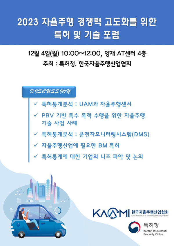 또한 관련 기업의 자율주행 기술 사업 사례를 공유하고 기업들을 위한 자율주행산업 맞춤 특허 전략도 소개한다.