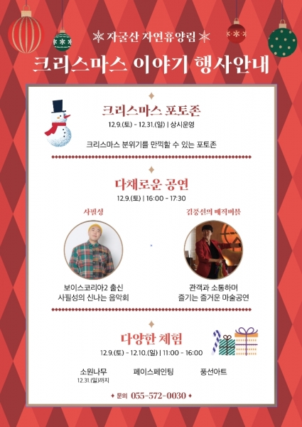 [금요저널] 의령군은 크리스마스를 앞두고 오는 9일부터 어린이와 가족단위 방문객을 위한 ‘자굴산 자연휴양림 크리스마스 이야기‘ 행사를 개최한다.
