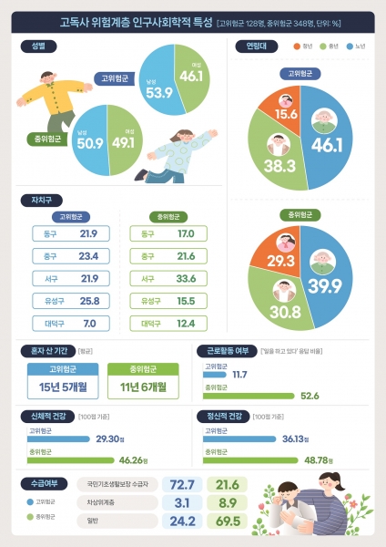 또한, 위험군별 특성을 구체적으로 살펴보고자 대전시 거주 18세 이상 1인 일반가구 1,000명에 동 행정복지센터의 추천 1인 취약가구 234명을 합한 1,234명을 대상으로 조사해 고위험군 128명 중위험군 348명 일반가구 758명의 응답 결과를 분석했다.