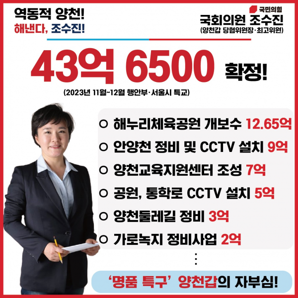 조수진 최고위원, 양천구 특별교부금 43억 6500만원 확정
