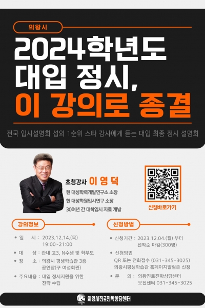 설명회 참여 신청은 12월 4일부터 의왕시 평생학습관 홈페이지 또는 QR 접수 및 유선으로 선착순 300명을 모집하며 설명회 참석자에게는 정시 자료집과 배치표를 무료로 제공한다.