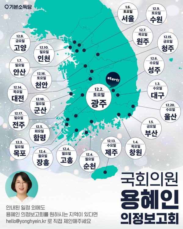 [금요저널] 기본소득당 용혜인 의원이 12월 8일부터 10일까지 경기·인천 지역에서 의정보고회를 개최한다.