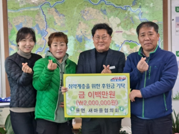 [금요저널] 이천시 율면 남·녀 새마을협의회[회장 박현수, 부녀총회장 박경애]는 2023.12. 8일 율면행정복지센터를 방문해 연말연시 저소득 취약계층을 위해 사용해 달라며 율면“행복한 동행”에 후원금 2백만원을 기탁했다.