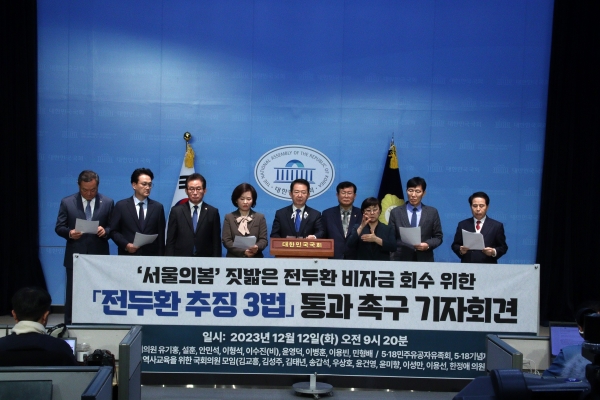 [금요저널] 12일 국회 소통관에서 더불어민주당 이용빈, 설훈, 안민석, 유기홍, 이형석, 이수진 의원과 올바른 역사 교육을 위한 국회의원 모임, 5·18민주유공자유족회, 5·18기념재단 관계자들이 전두환 비자금 회수를 위한 ‘전두환 추징3법’ 통과 촉구 기자회견을 가졌다.
