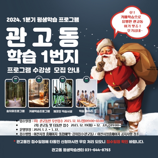 관고동 1분기 프로그램은 12월 18일부터 22일까지 이천시청 통합예약을 통해 접수할 계획으로 이번에는 관고동 우선 접수 일정과 관고동 및 타동 접수 일정을 구분해 접수계획을 발표했다.