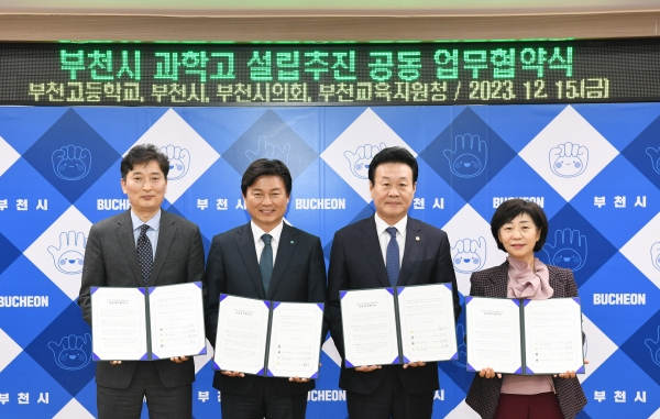 부천시는 15일 시청 만남실에서 부천고등학교·부천시의회·부천교육지원청과 ‘부천시 과학고 설립을 위한 공동 업무협약(MOU)’을 체결했다. 이날 업무협약에는 조용익 부천시장을 비롯해 최성운 부천시의회 의장, 김선복 부천교육지원청 교육장, 김영찬 부천고등학교장 등이 참석했다.
