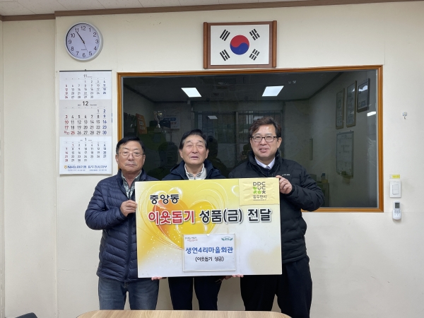 김태화 중앙동장은 “관내 소외된 계층을 위한 생연4리 마을회관의 따뜻한 관심에 감사하다며 전달해 주신 기부금은 어려운 이웃들을 위해 소중히 사용하겠다”고 전했다.