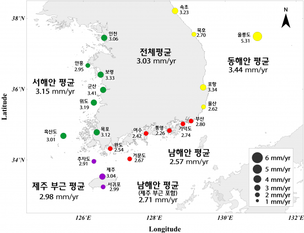 1989년부터 2022년까지 34년간 해역별 평균 해수면 상승률은 동해안이 연 3.44mm로 가장 높았고 이어서 서해안, 남해안 순으로 나타났다.