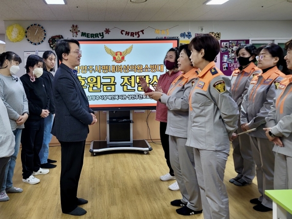 [금요저널] 남양주시평내여성의용소방대는 지난 19일 남양주시장애인복지관 성인주간보호센터에 ‘연말 사랑 나눔 후원금’을 전달했다.