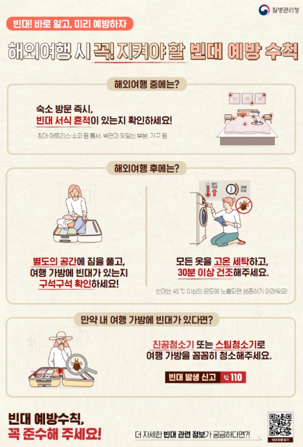 해외여행 후 집에서는 별도의 공간에 짐을 풀고 여행 가방에 빈대가 있는지 확인하고 옷은 고온 세탁 후 30분 이상 건조해야 한다.