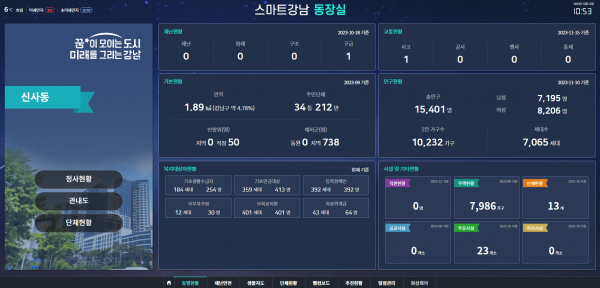스마트강남 동장실은 동 현황을 한눈에 파악할 수 있는 디지털 현황판이다.