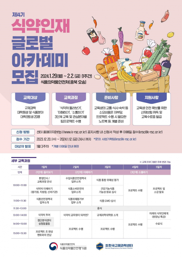 [금요저널] 식품의약품안전처는 식품 분야 규제과학 인재를 양성하기 위해 식품 분야 대학생과 규제과학대학원생을 대상으로 ‘제4기 식약인재 글로벌 아카데미’ 참가자를 12월 20일부터 1월 12일까지 모집할 계획이라고 밝혔다.