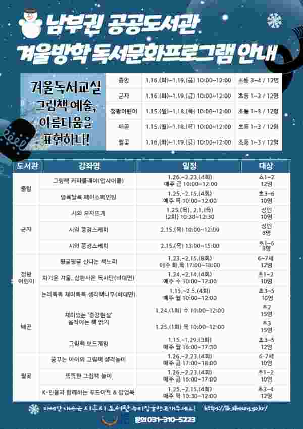 남부권역 5곳의 공공도서관에서 운영되는 겨울방학 프로그램은 매우 알차다.