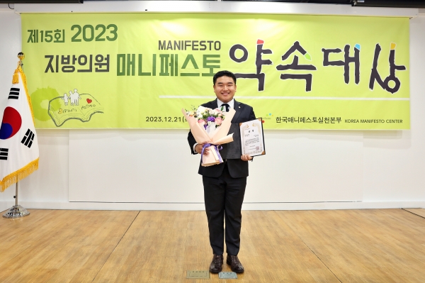 [금요저널] 의왕시의회 한채훈 의원이 21일 한국매니페스토실천본부가 주최한 ‘2023 지방의원 매니페스토 약속대상’ 좋은조례 부문 최우수상을 수상했다.