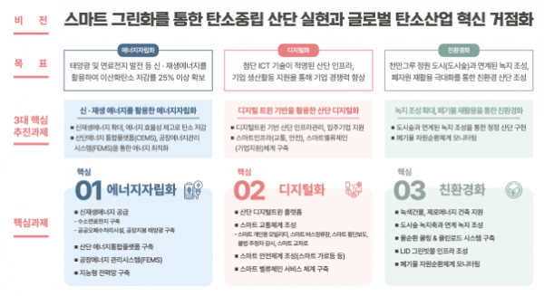 스마트그린 산업단지는 입주기업과 기반시설 등의 디지털화, 에너지자립 및 친환경화를 추진하는 산업단지로 이산화탄소 배출 저감 계획을 별도로 수립하지 않는 일반적인 산업단지와 달리 신재생에너지 발전 등을 포함해 이산화탄소 예상 배출량의 25% 이상을 저감하도록 계획한다.