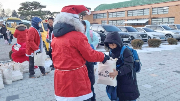 [금요저널] 영북면 행정복지센터는 영북면 청소년지도협의회, 주민자치위원회, 이장협의회가 지난 22일 영북초등학교 앞에서 산타와 함께 하는 행복한 크리스마스를 진행했다고 밝혔다.