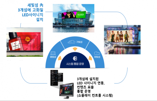 ㈜세빛섬은 예빛섬, 가빛섬, 채빛섬에 영화관 스크린 규모의 대형 전광판을 설치해 상업광고 공익광고 행사 콘텐츠 등을 송출한다.