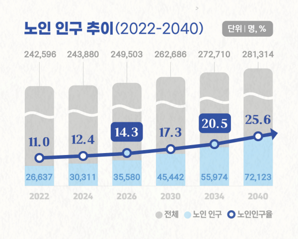 경기도 14.5%, 전국 17.1%에 비해 낮은 편이나, 관내 노인 인구 비중은 지속적으로 증가세를 보이고 있어 2034년에는 인구 5명 중 1명이 노인이 될 전망이다.