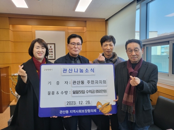 김문식 관산동 주민자치회장은 “일일찻집 수익금이 우리 동 어려운 이웃에게 꼭 필요한 사업으로 골고루 쓰이길 바란다 우리 주민자치회에서 선두가 되어 계속해서 아름다운 기부가 이어지고 따뜻한 지역사랑이 실천되기를 기대한다”고 전했다.