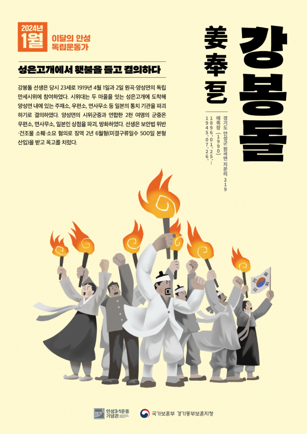 [금요저널] 안성시와 국가보훈부 경기동부보훈지청은 공동으로 안성3.1독립만세운동에 참여한 독립운동가 강봉돌 선생을 ‘2024년 1월 이달의 안성 독립운동가’로 선정했다.