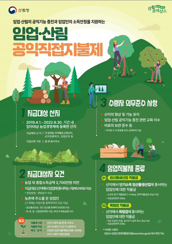 임업직불금은 2022년부터 도입됐으며 임업·산림의 공익기능 증진과 임업인의 낮은 소득을 보전하기 위해 지급 대상 산지에서 임업에 종사하고 있는 임업인과 농업법인이 자격요건을 갖춘 경우에 지급한다.