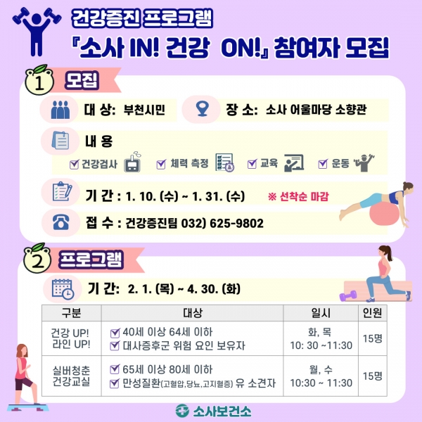 이번 프로그램은 ‘소사 인 건강 온’이라는 슬로건 아래, 지역사회 건강관리체계를 구축하고 건강생활실천 분위기를 확산하기 위해 마련된 사업이다.