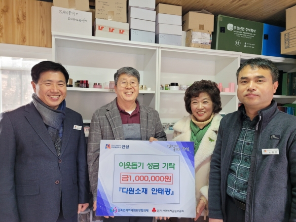 [금요저널] 안성시 일죽면에 위치한 기업 다원소재는 지난 4일 일죽면 행정복지센터를 방문해 이웃돕기 성금 100만원을 기부했다.