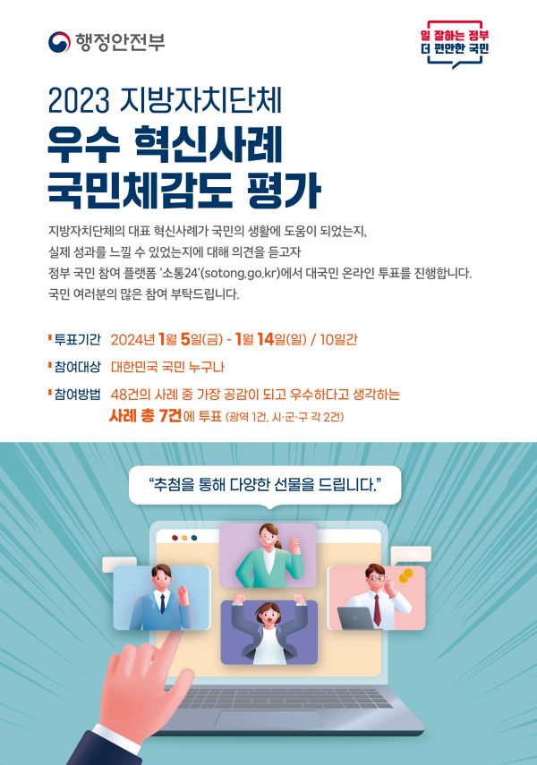 [금요저널] 행정안전부는 2023년 지방자치단체 혁신평가의 일환으로 국민이 직접 참여하는 ‘국민체감도 평가’를 오는 1월 14일까지 실시한다고 밝혔다.