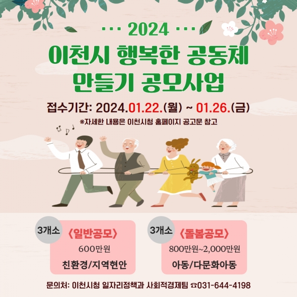 [금요저널] 이천시는 2024년 1월 22일부터 ‘2024년 행복한 마을공동체 만들기 공모사업’에 참여할 공동체를 오는 2024년 1월 26일까지 모집한다.