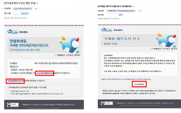 [금요저널] 부가가치세 신고 연말정산 시기를 맞아 “전자세금계산서 발급”, “세무조사 출석요구 안내” 등 국세청을 사칭한 다양한 종류의 악성 이메일 문자메시지 등이 유포될 우려가 있으니 납세자의 각별한 주의가 요구된다.