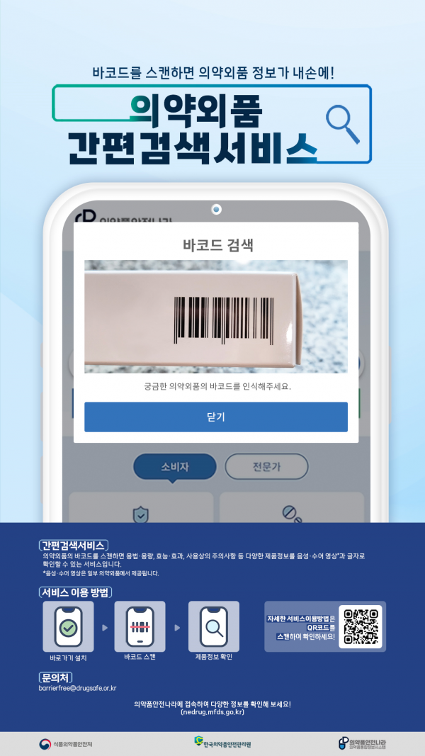 ‘식의약 규제혁신 2.0’ 디지털 안전관리 혁신의 일환으로 지난해 12월 26일부터 시작된 ‘의약외품 모바일간편검색서비스’는 스마트폰으로 의약외품에 표시된 바코드를 인식하면 해당 품목의 안전정보를 글자·음성·수어영상으로 제공하는 서비스다.